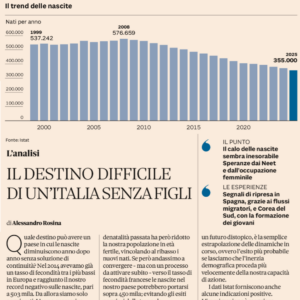 Quale destino può avere un paese in cui le nascite diminuiscono anno dopo anno senza soluzione di continuità? Nel 2014 avevamo già un tasso di fecondità tra i più bassi in Europa e raggiunto il nostro record negativo sulle nascite, pari a 503 mila. Da allora siamo solo peggiorati.
