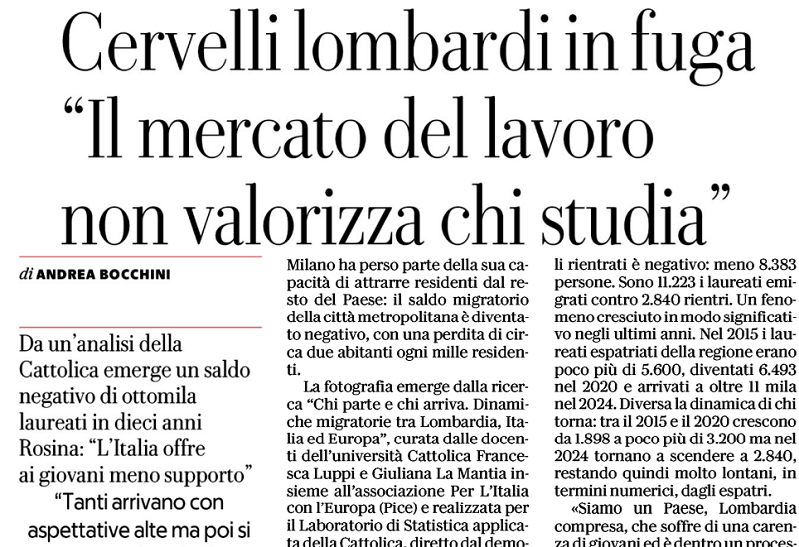 L’analisi della Cattolica sui giovani che lasciano la regione dopo aver conseguito il titolo di studio: pesa la percezione di poca meritocraziafonte > LA REPUBBLICA - 12 Marzo 2026