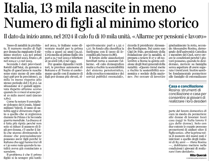 Nei primi sette mesi del 2025 la media è scesa a 1.13 figli per donna. Il demografo Rosina: «Mettere in condizione i giovani di realizzare i loro desideri e le donne di lavorare»fonte > CORRIERE DELLA SERA - 22 Ottobre 2025