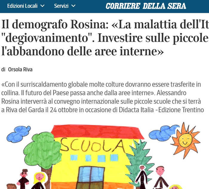 «Con il surriscaldamento globale molte colture dovranno essere trasferite in collina. Il futuro del Paese passa anche dalla aree interne». Alessandro Rosina interverrà al convegno internazionale sulle piccole scuole a Riva del Garda il 24 ottobre in occasione di Didacta Italia (Trentino)fonte > CORRIERE DELLA SERA - 14 Ottobre 2025