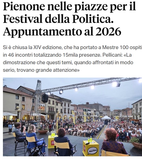 Si è chiusa la XIV edizione, che ha portato a Mestre 100 ospiti in 46 incontri totalizzando 15mila presenze. Pellicani: «La dimostrazione che questi temi, quando affrontati in modo serio, trovano grande attenzione»fonte > VENEZIA TODAY - 15 Settembre 2025