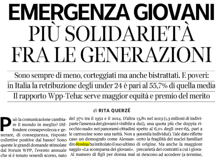 Al numero di figli per donna mai così basso (sotto 1,2) si aggiunge oggi, come se non bastasse, il fenomeno della «fuga dei talenti».fonte > CORRIERE DELLA SERA - 1 Dicembre 2025