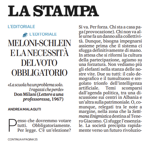 Chi avesse voglia di leggere il libro di Alessandro Rosina, riscoprirebbe che in tempi molto più inquieti e poveri di questi, dopo il disastro della Seconda guerra mondiale, una serie di esecutivi claudicanti immagina un’Italia capace (per trent’anni) di ridefinire alla radice il senso di sé.fonte > LA STAMPA - 16 Novembre 2025