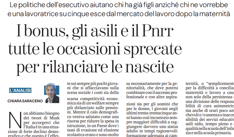 È da almeno quarant’anni che l’Italia è un Paese a bassa fecondità, riducendo il numero dei potenziali genitori ad ogni passaggio generazionale (la progressiva “scomparsa dei giovani”, come si intitola l’ultimo libro del demografo Alessandro Rosina).fonte > LA STAMPA - 14 Novembre 2025